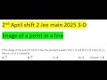 \[ \vec{PM} = ( (4-\lambda) - 1 )\hat{i} + ( (7-2\lambda) - 0 )\hat{j} + ( (1+2\lambda) - 3 )\hat{k} \] \[ \vec{PM} = (3-\lambda)\hat{i} + (7-2\lambda)\hat{j} + (-2+2\lambda)\hat{k} \]Since \( \vec{PM} \) is perpendicular to the line, its dot product with the direction vector \( \vec{d} \) must be zero.